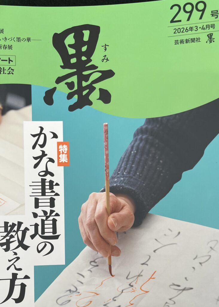 日頃からご指導いただいている現代書道研究所理事長佐伯方舟先生のインタビュー記事が、芸術新聞社刊『墨』299号2026年3.4月号の特集「かな書道の教え方」コーナーに掲載されています。書道研究銀河会競書誌『COSMOS銀河』の表紙とともに、手本揮毫を担当しておられる「かな実践講座」のページ(2025年11月号)の写真も紹介されました。漢字、かな、現代書道についての情報が盛りだくさんです。「日本の書道文化」をたくさんの方に知っていただき、楽しんでいただきたいです。