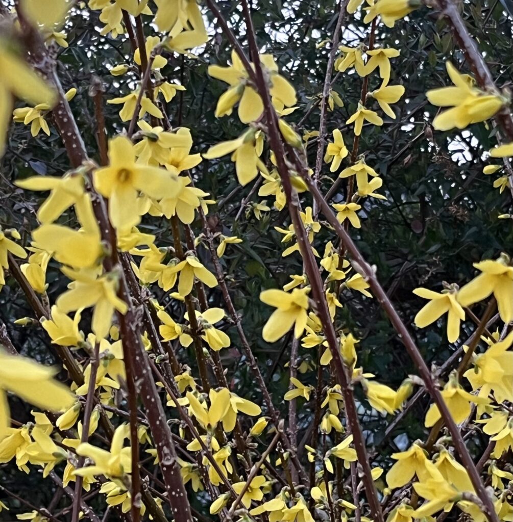 近所の公園に低木のレンギョウがたくさん咲いています。花言葉は「希望」「期待」など。新年度に向けて、明るい心持ちと元気をもらいました。和紙の原料になるミツマタ(三椏)も今が花盛り。黄色と白のとてもかわいい花が咲きますよ。