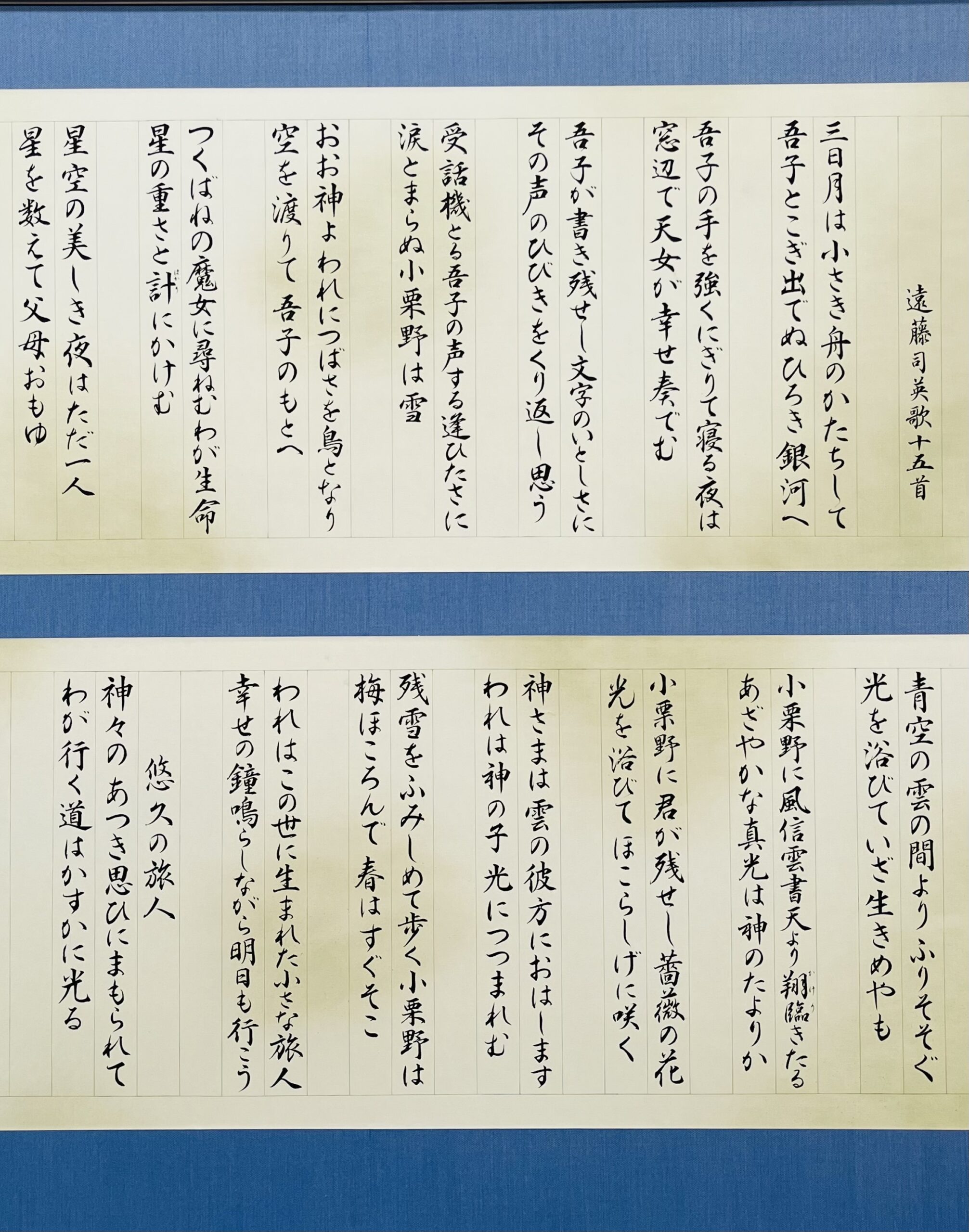去る10月22日に現代書道研究所主催第46回日本書展が閉幕しました。会場では毎年、出品者の思いや作品制作の意図などを文章でご紹介しています。18歳から最高年齢100歳の方も出品され、今年もたくさんの「書道愛」が満ちあふれて大きな学びと交流が広がりました。るり国分寺本部の出品者の作品もご高覧いただき、温かいお励ましの言葉を頂戴しまして、誠にありがとうございました。来年への抱負を胸に、ともに豊かに美しい書の表現にチャレンジしてまいります。